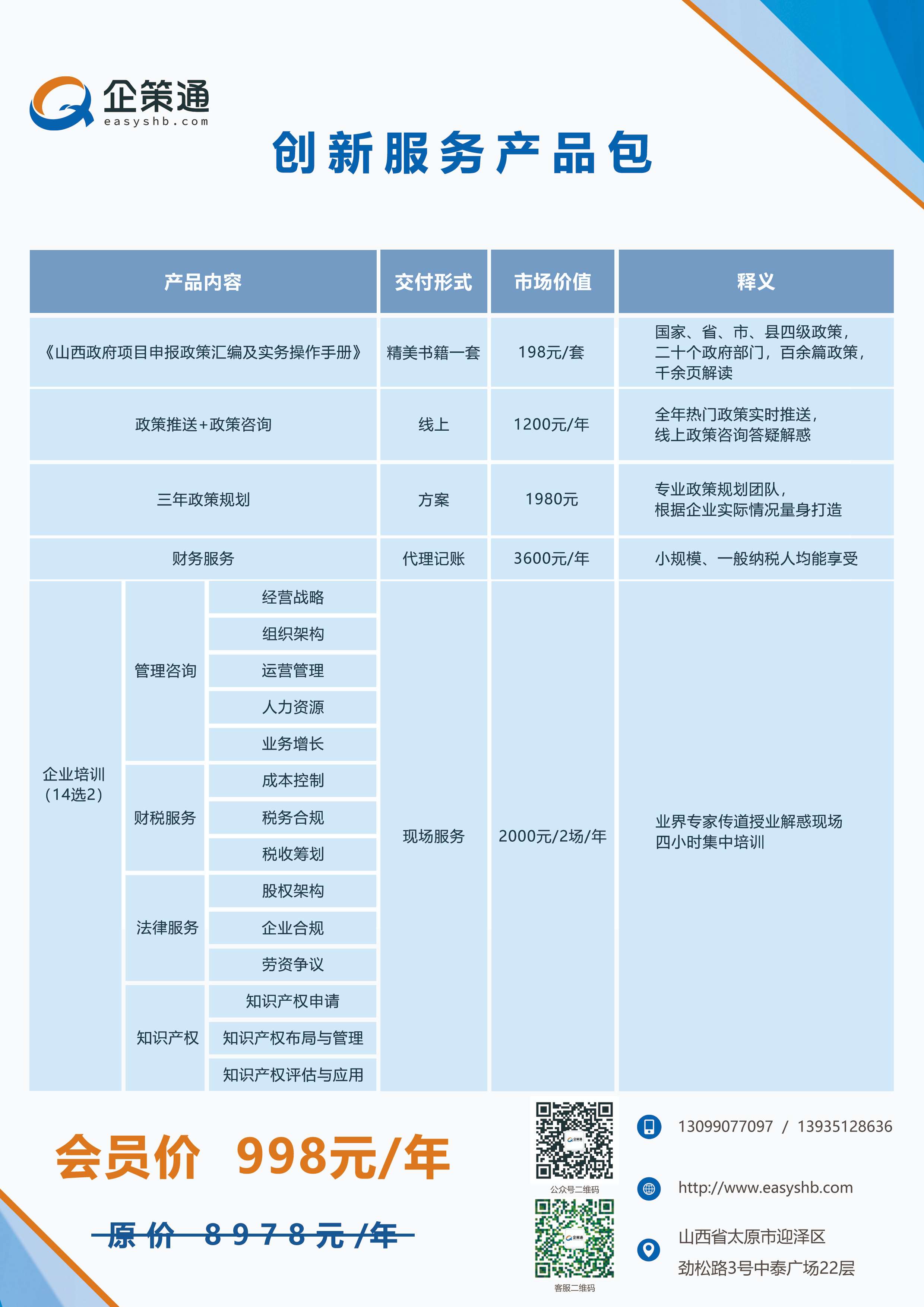 企策通“创新服务产品包”包括5大模块内容,《山西政府项目申报政策汇编及实务操作手册》一套+及时政策推送和咨询+三年政策规划+代理记账服务+14选2现场企业培训。其中《山西政府项目申报政策汇编及实务操作手册》覆盖国家、山西省、市各部门出台的省内相应政策、涵盖资金补贴、财税扶持、知识产权等类型政策内容,适合各行各业政策申报;14选2现场企业培训包括管理咨询、财税服务、法律服务、知识产权等方面现场集中培训、答疑解惑。